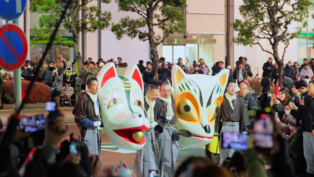 Led by foxes in formal Kamishimo (samurai ceremonial dress), the line continues with children and adults in various kimonos and fox guises. The sight is a “Parade of One Hundred Foxes” (Hyakko Yako), a playful twist on the legendary “Parade of One Hundred Demons.”