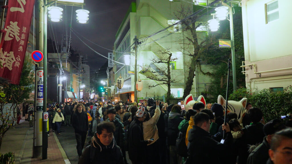 The flickering lanterns and the line of foxes move slowly down the street, turning right at the “Hokutopia” building toward Oji Inari Shrine.