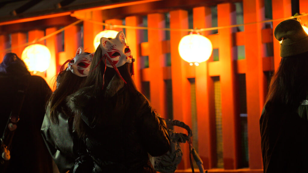 Lanterns are lit, and visitors wearing kimonos and fox masks come and go.