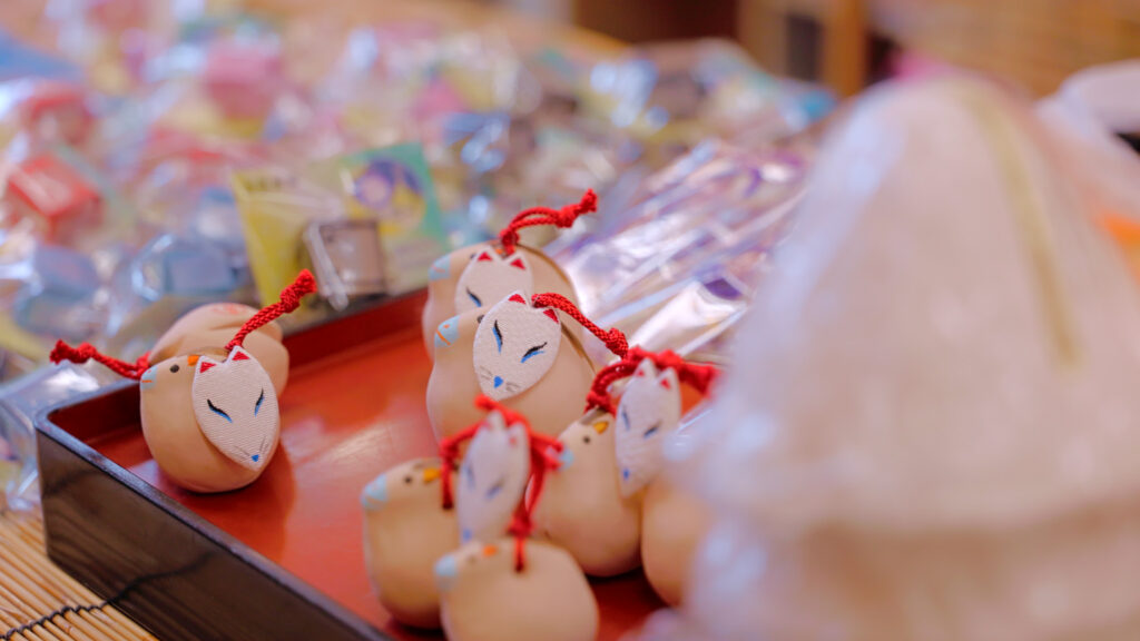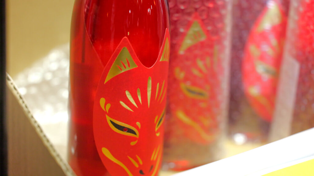 At Shozoku Inari, you can buy fox-themed sake and giant fox-tail-shaped Fugashi (dried wheat gluten snacks).