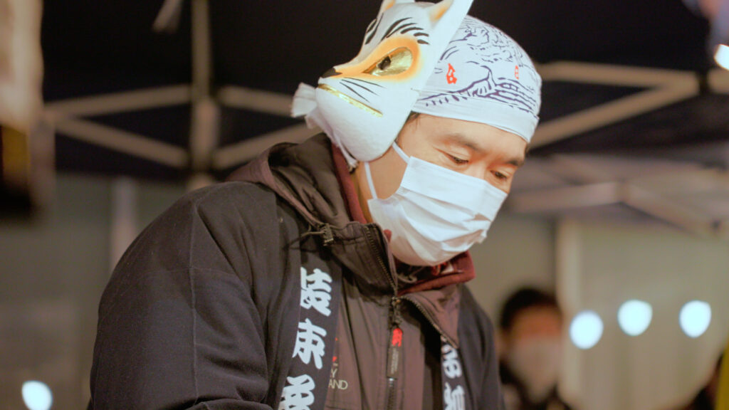 The tense atmosphere at Shozoku Inari Shrine changes as the New Year opens. To the sound of traditional music and wooden clappers echoing in the night, the procession begins.